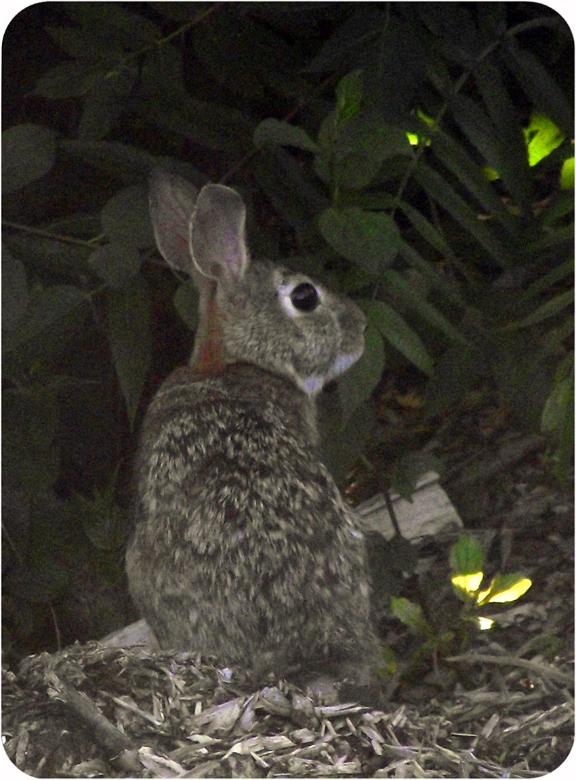 Below - the real deal, recorded with a zoom lens. This was taken at noon on a sunny day... the bunny is hiding in a dark thicket.