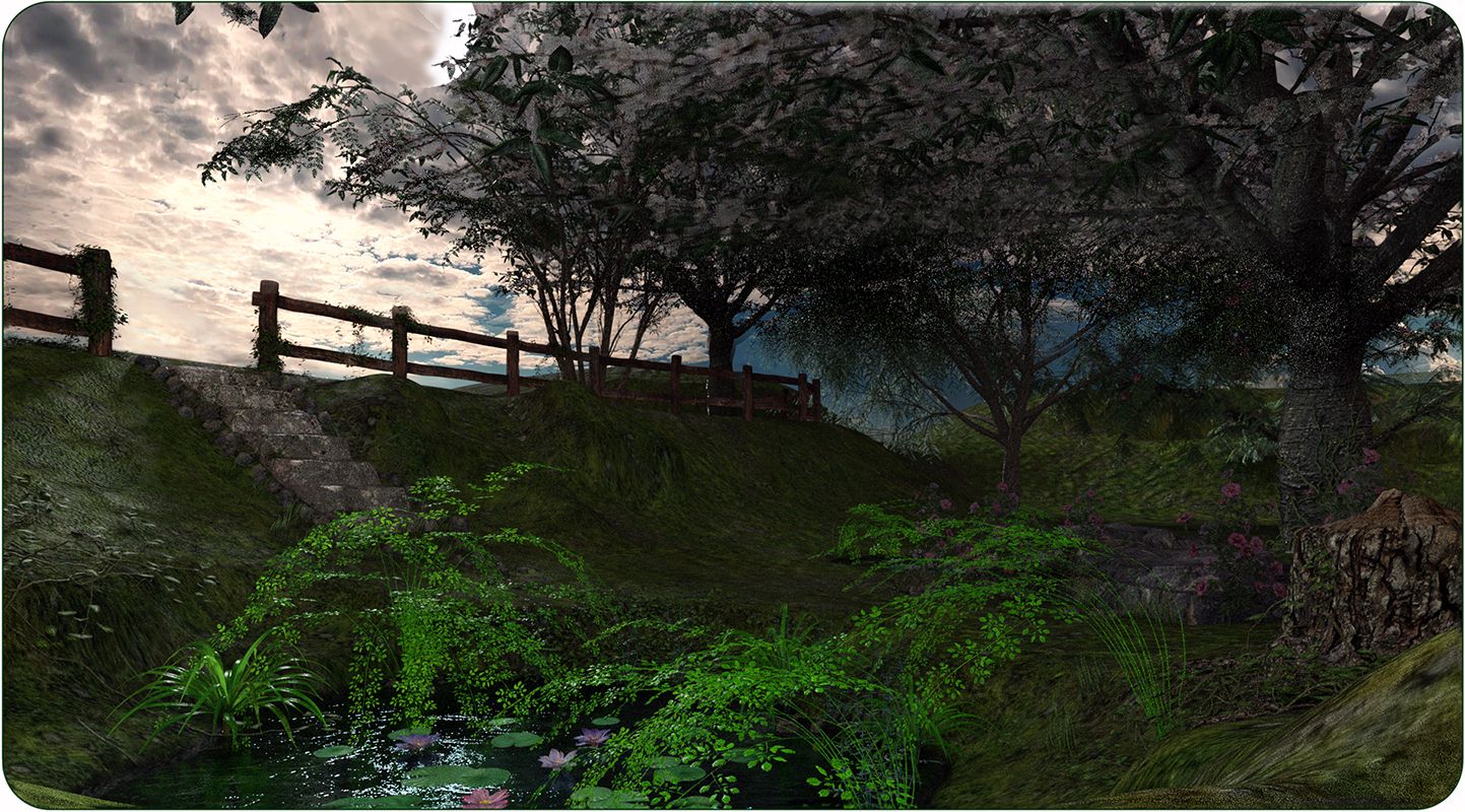 The moat kind of peters out a ways beyond the castle. This is from a picture we were working on in early April, 2017. All done on the computer; it's a rendering of Magix101's Secret Valley set in the Digital Art Zone (external link)