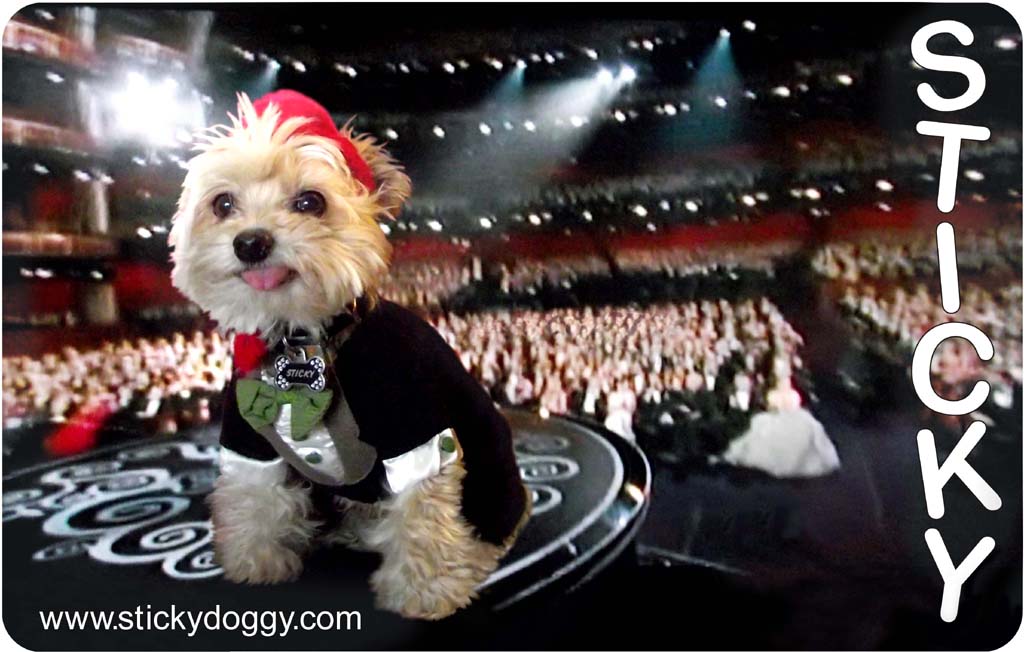 Sticky looked dapper in his tux, onstage at the Academy Awards in 2013. He was a runaway for Best Canine Actor in a picture that wasn't even ready, “Stick-tanic in 3-D”!