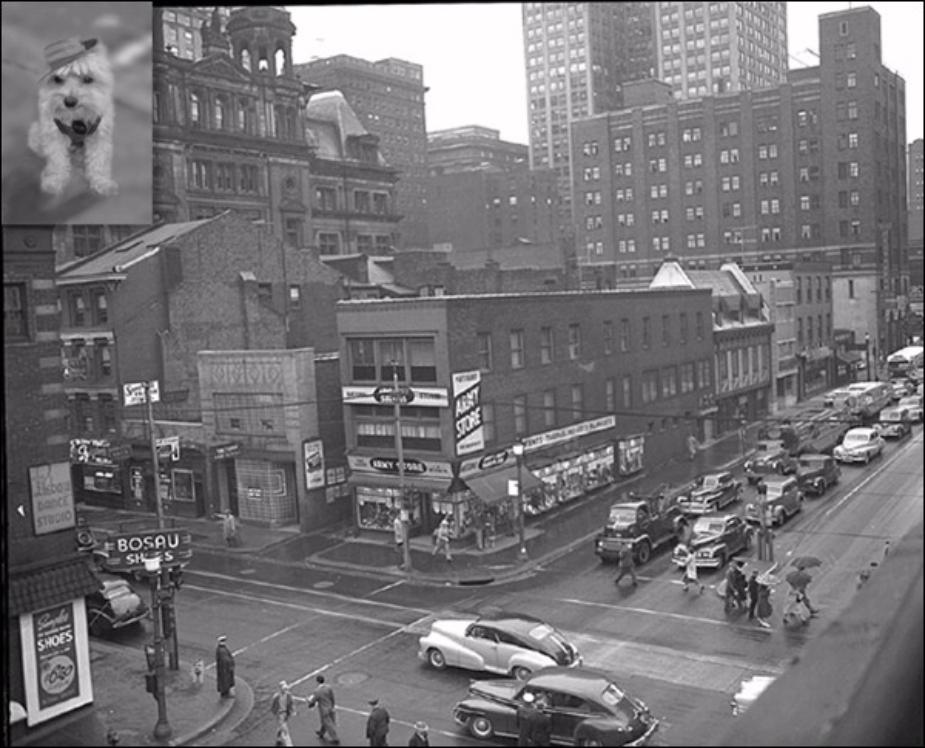 Time-traveller Sticky (see inset detail - Sticky is on the street corner at lower left, next to the big cop in the raincoat), wearing his period fedora hat, considers his options on a rainy street corner in Pittsburgh, Pennsylvania in 1953. He seems to be wondering if maybe he ought to go "back to the future".